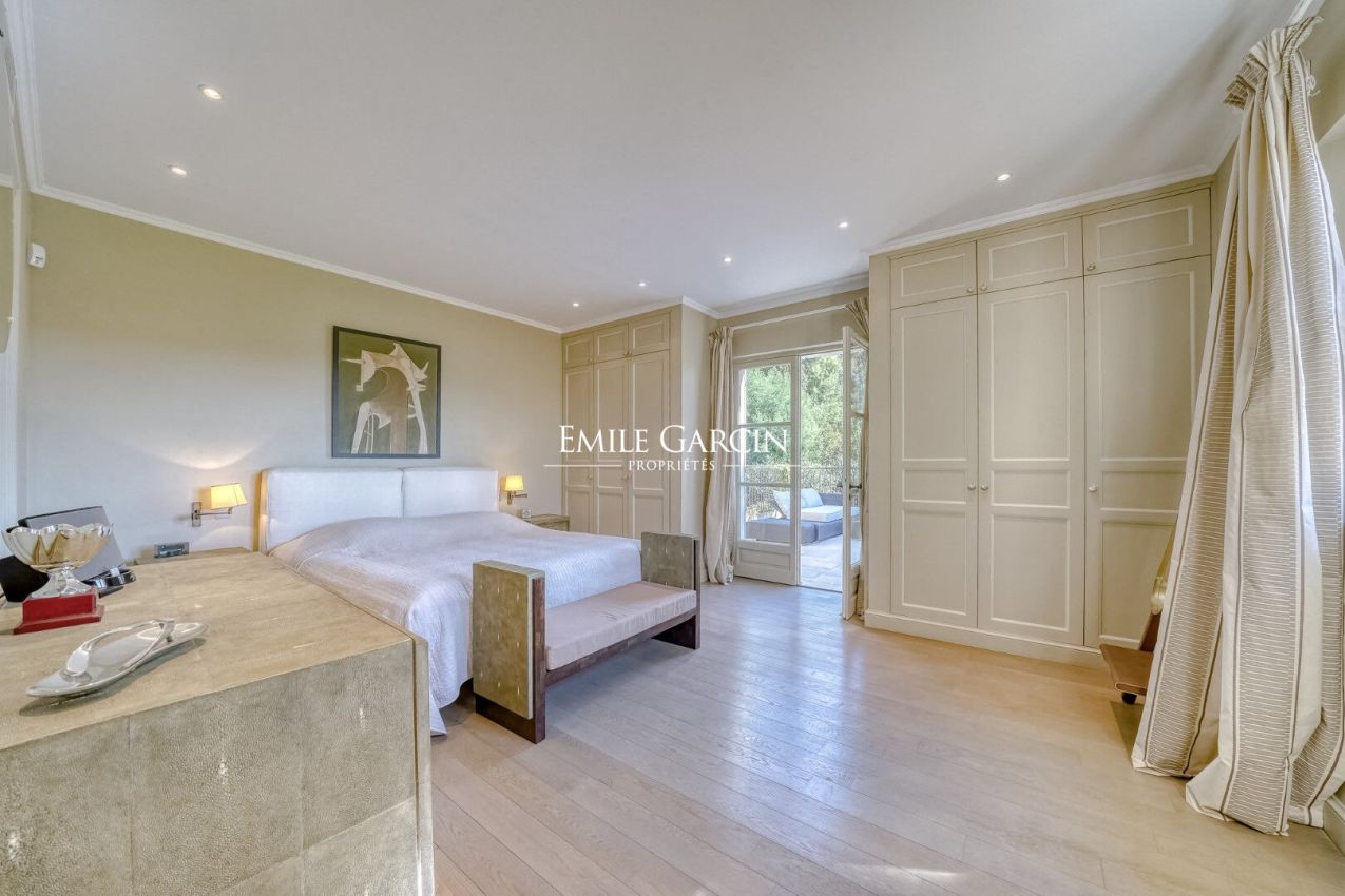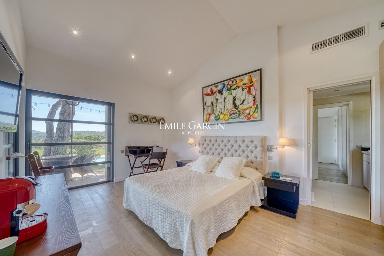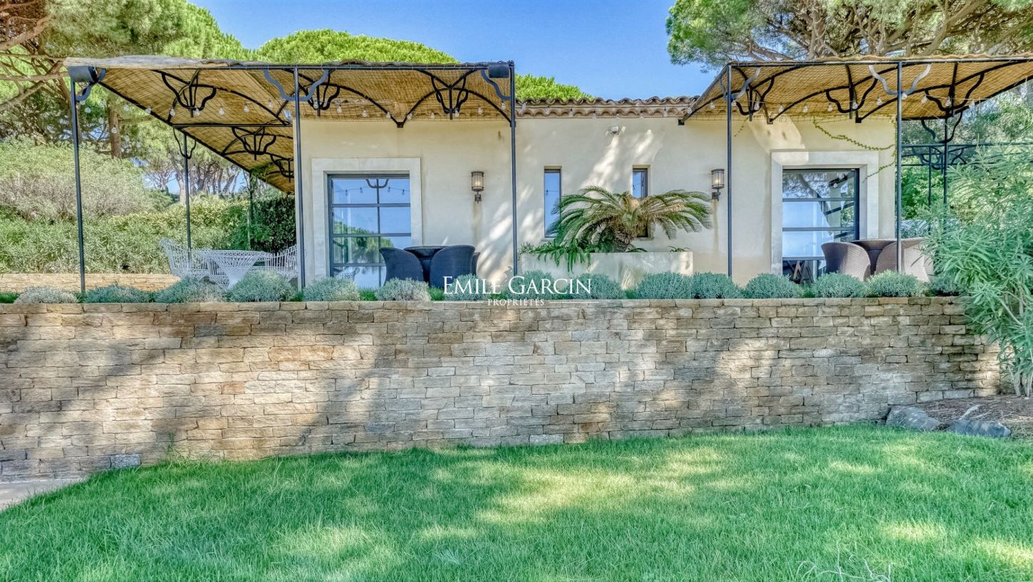 Dans le prestigieux domaine privé et sécurisé des Parcs de Saint-Tropez, véritable presqu'île de 200 hectares entourée de criques privées abritant les plus belles propriétés, propriété à la location de 600 m² de style contemporain au coeur d'un jardin paysager de 8 000 m².