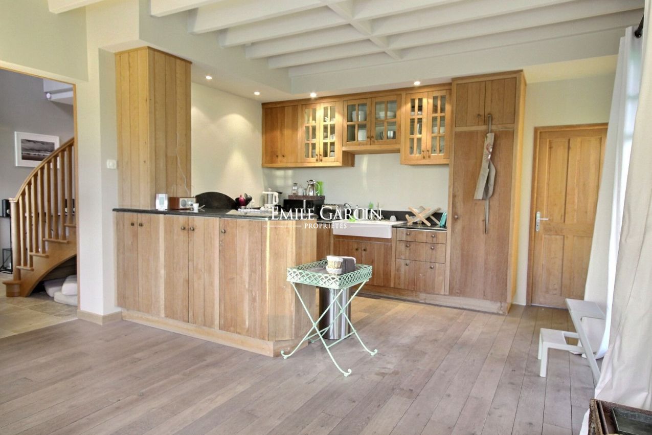 En Normandie, à Saint-Hymer, à moins de 10 minutes de Pont l'Evêque, Emile Garcin vous propose une jolie maison en bois à la location saisonnière d'environ 285 m² offrant de grands volumes intérieurs. Elle se compose de 9 pièces dont 5 chambres et 4 salles de bains qui entourent le palier de l'étage.