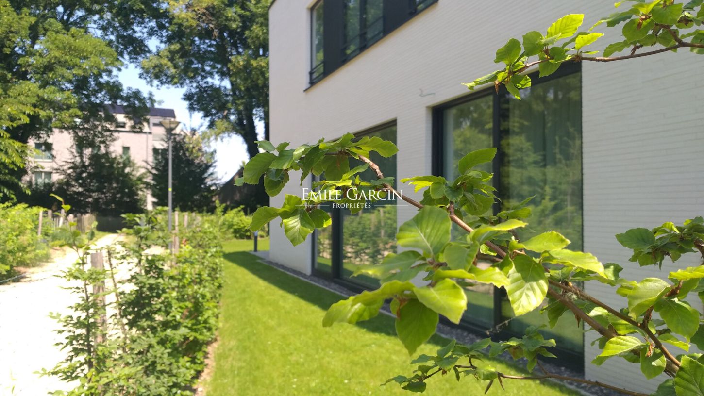 Idéalement située dans un clos résidentiel à proximité d'une réserve Natura 2000, magnifique maison neuve de 245 m² avec jardin paysagé et une terrasse de 21 m². Un hall d'entrée avec vestiaire et toilette visiteurs mène vers un espace de vie ouvert comprenant salon, salle à manger avec une cuisine américaine hyper équipée. A l'étage, un hall de nuit distribue 4 chambres avec placards intégrés, une salle de douches, une toilette séparée et une buanderie. Au 2e étage, spacieuse suite parentale d'environ 51 m² avec dressing et salle de bains (bains et douche) et une toilette séparée. Prestation de qualité avec de belles finitions élégantes et des réceptions baignés de lumière naturelles. La maison dispose également de rideaux et voilage à toutes les fenêtres. Carport, petit chalet de rangement extérieur, un emplacement de parking supplémentaire. PEB : B Charges forfaitaires : 75 euros/mois pour entretien jardins et collecte des déchets. Autres : Système d'alarme, vidéophonie, ventilation double flux (VMC), adoucisseur d'eau, toiture végétale.