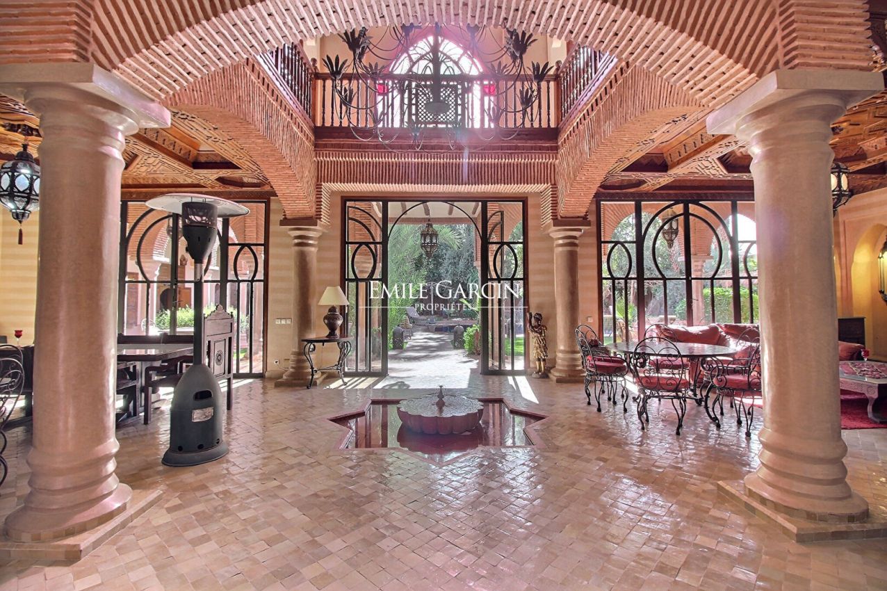 Superbe maison de style oriental à vendre aux portes de Marrakech à seulement 5 minutes du centre-ville, dans un véritable écrin de verdure de 2270m2 et d'une surface habitable de 1200m2 sur 3 niveaux ; en RDC une belle pièce de vie avec double cheminée, cuisine et arrière cuisine professionnelle, un bureau, 5 chambres et suites, à l'étage une piscine de 8x3m avec solarium ainsi que 5 suites de 30 à 40m2 chacune.