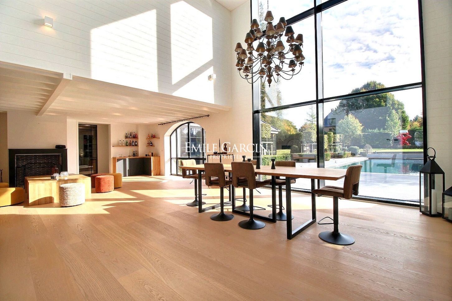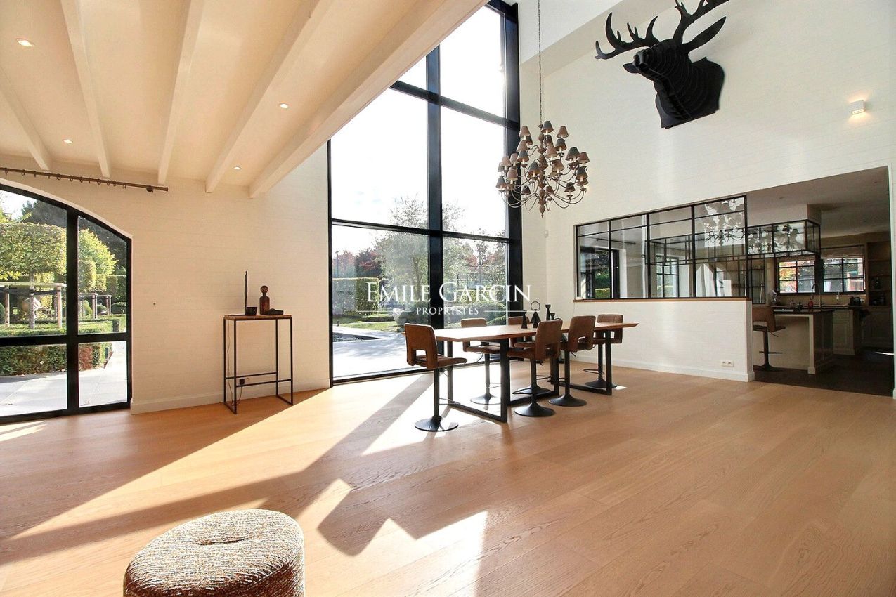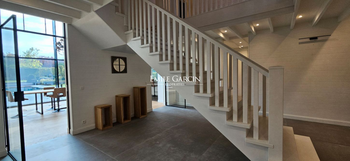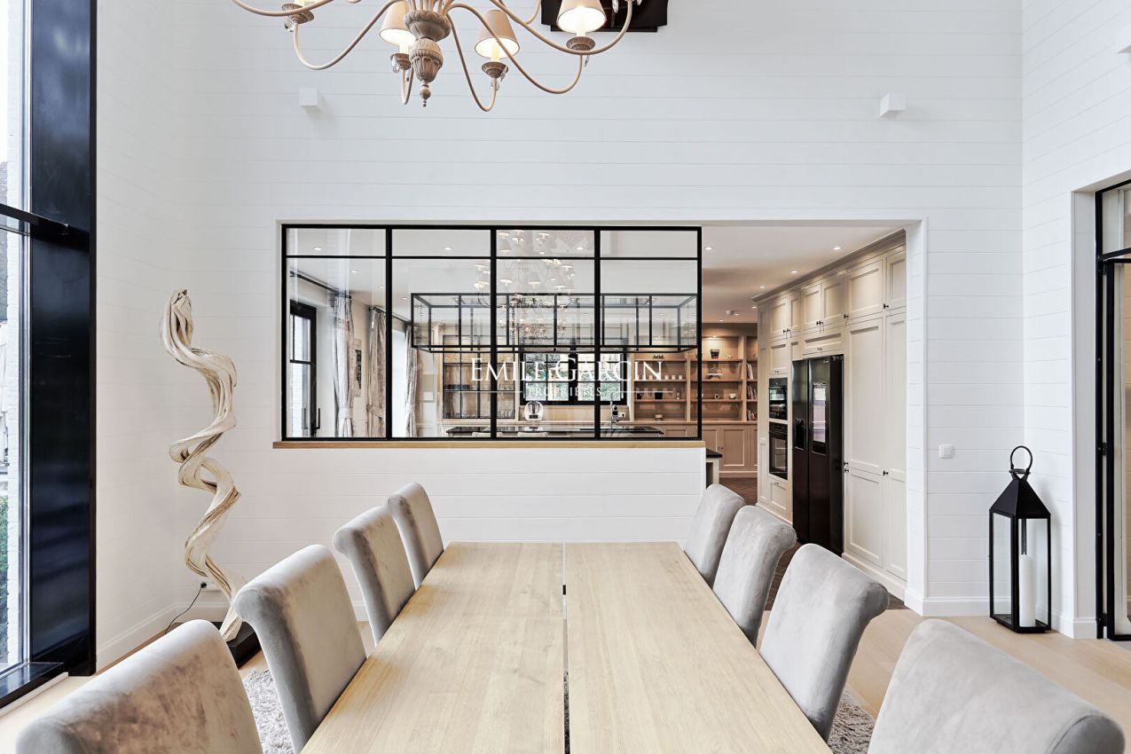 Dès le hall d'entrée, l'architecture intérieure révèle ses beaux volumes : un séjour lumineux aux lignes épurées composé d'un salon avec cheminée et d'une salle-à-manger habillée d'une grande baie vitrée et jouxtant une cuisine hyper équipée avec espace dînatoire.
