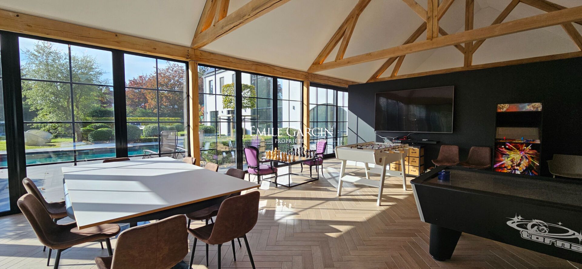 Les combles aménagés avec soin, proposent une spacieuse salle de jeux (ou une 5e chambre) ainsi qu'une 6e chambre de belle dimension, créant un espace adaptable pour répondre aux envies de chacun, créant un espace adaptable aux envies de chacun. Pensé pour la détente et la convivialité, le sous-sol comprend un terrain de mini-foot avec vestiaires et douches, ainsi qu'un espace pétanque trés convivial.