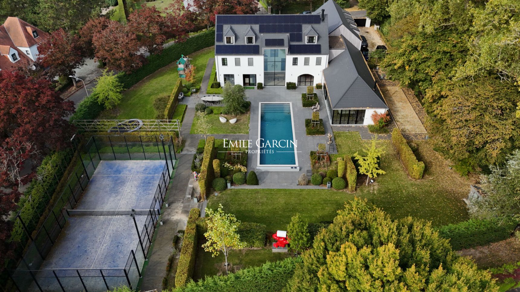 A l'extérieur, le jardin paysager se déploie autour d'une vaste terrasse plein sud, d'une piscine chauffée, d'un terrain de padel, d'un second espace pétanque et d'une aire de jeux pour enfants.