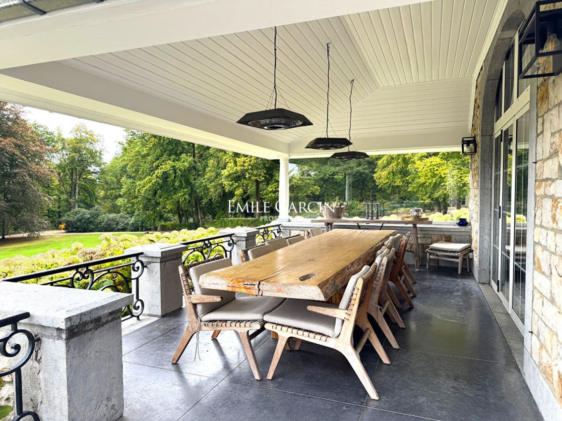 Nichée sur les hauteurs verdoyantes de Spa, au sein d'un parc privé d'environ 7 hectares, cette propriété d'exception jouit d'une rare quiétude et d'une magnifique vue panoramique dominant la vallée. La demeure principale d'environ 1000 m² (selon PEB) accueille des espaces de vie baignés de lumière et ouverts sur la nature. Au rez-de-chaussée, un vaste hall d'entrée mène aux pièces de réception : un double séjour chaleureux avec cheminée, une salle à manger lumineuse et une cuisine entièrement équipée avec son arrière cuisine, alliant élégance et fonctionnalité. Aux étages, une grande suite parentale avec sa salle de bains, sa salle de douche et son dressing privatifs, dix autres chambres et neuf salles de bains complètent la partie nuit, permettant d'accueillir famille et invités en toute aisance. Le niveau inférieur est dédié au bien-être et aux loisirs : espace wellness avec sauna, jacuzzi et salle de sport, home cinéma et cave à vins viennent parfaire cet ensemble d'exception. Un bâtiment indépendant abrite une conciergerie comprenant trois chambres, ainsi que trois garages fermés pouvant accueillir quatre voitures, trois boxes, une sellerie, et un fenil. Ce ravissant parc arboré est agrémenté d'une piscine au panorama exceptionnel avec son pool house composée d'une cuisine d'été, d'un salon avec brasero, un espace à déjeuner, de douches et cabines. Un parking privé et une borne de recharge pour véhicules électriques complètent les prestations. Une lieu rare et idéal pour les amateurs d'espace, de nature et de confort haut de gamme. PEB E