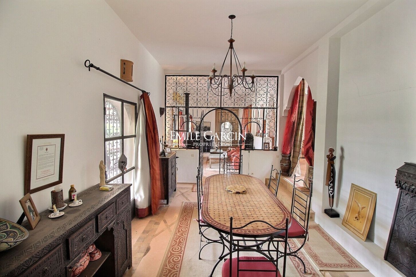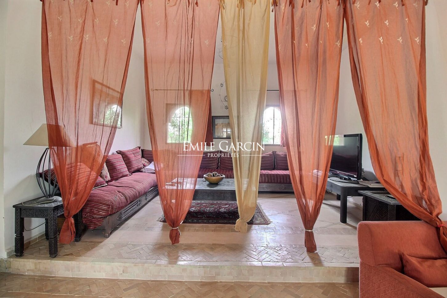Composée d'une réception, salon marocain et salle à manger, cuisine équipée, 2 chambres en rez-de-chaussée et un bureau, 1 studio avec un coin salon et une salle de bain, à l'étage, 1 grande chambre avec vue sur les montagnes de l'Atlas.