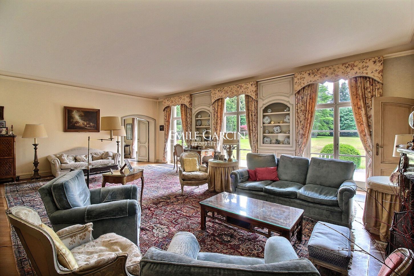 Cette demeure d'environ 550m² est composée de spacieuses réceptions donnant sur une vaste terrasse et le parc. Un élégant hall d'entrée, un vestiaire, de vastes réceptions comprenant un beau salon, un bureau, un petit salon et une agréable salle à manger s'ouvrant sur un jardin parfaitement orienté ainsi qu'une grande cuisine avec une entrée de service et un salon enfants.