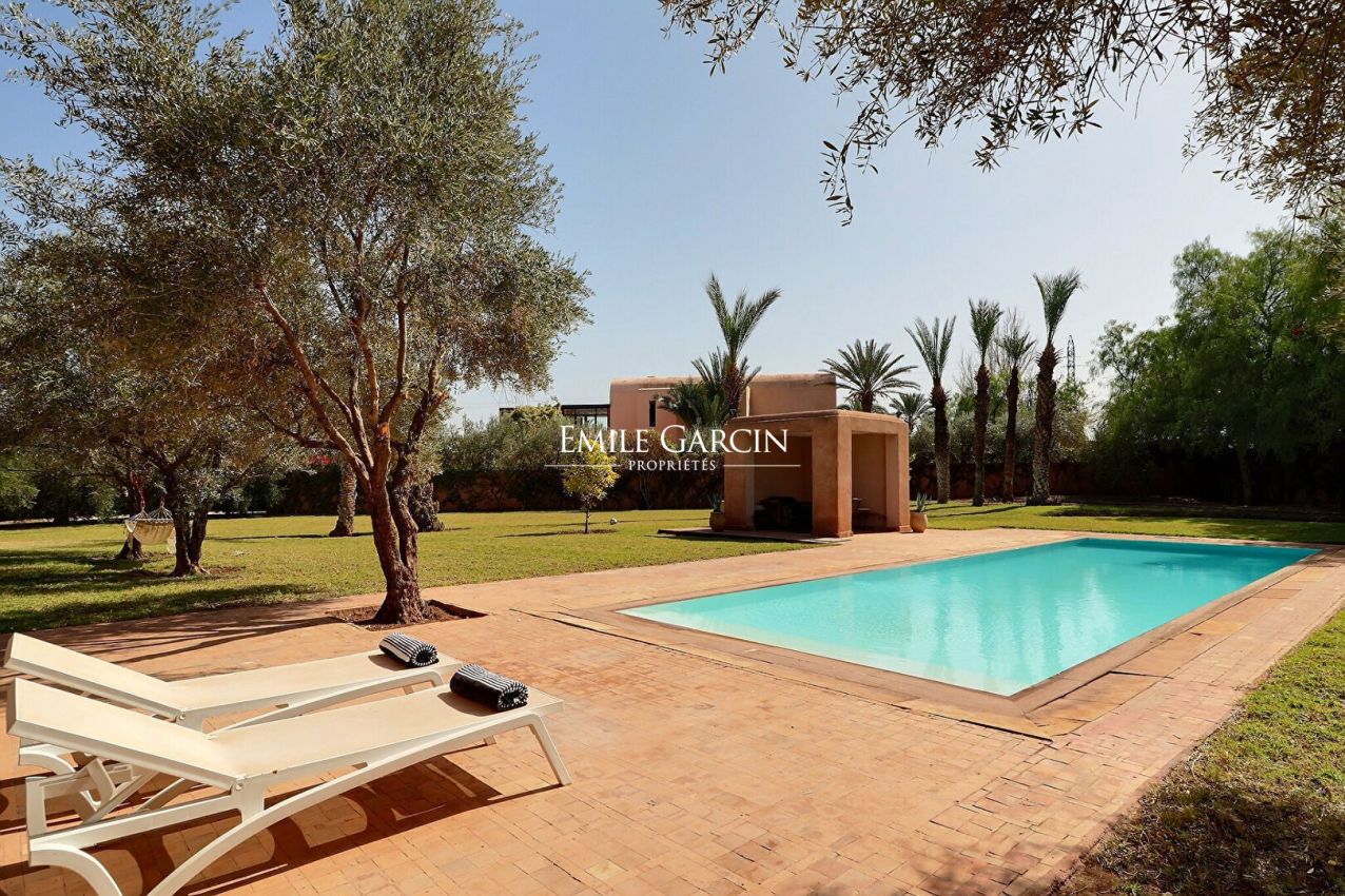 Cette jolie maison contemporaine de 450m2, située à seulement 10 km de Marrakech, route de l'Ourika, est idéale pour un séjour de 6 à 8 personnes.