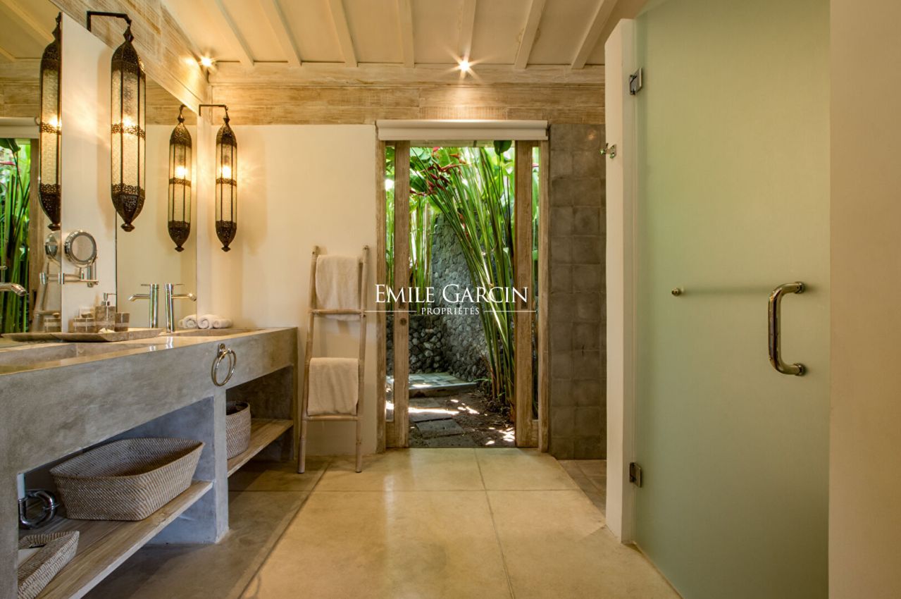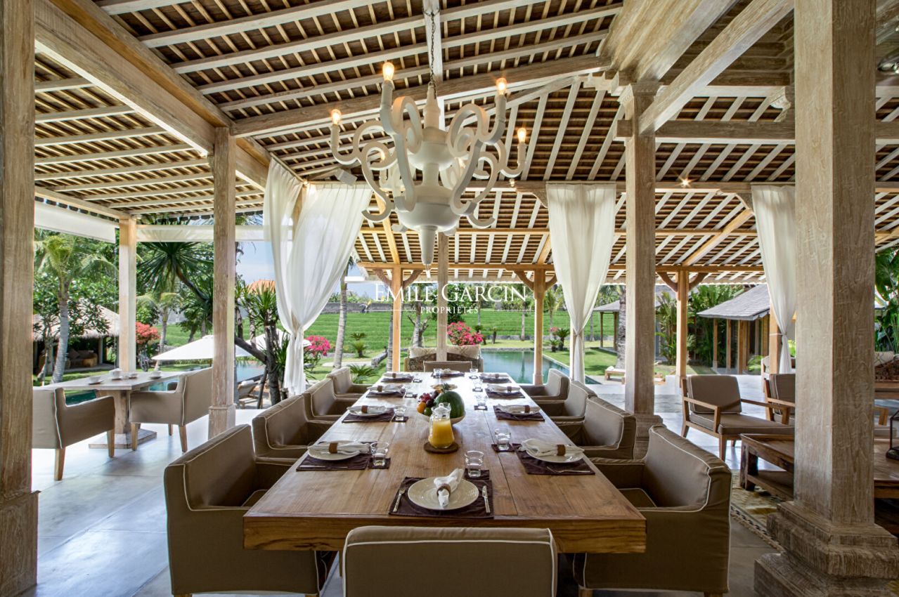 Nichée au coeur des rizières de Kerobokan, cette villa s'étend sur 800 m², offrant une évasion tranquille près de Seminyak. Cette retraite de 8 chambres comprend deux pavillons de style Joglo, alliant charme traditionnel et confort moderne.
