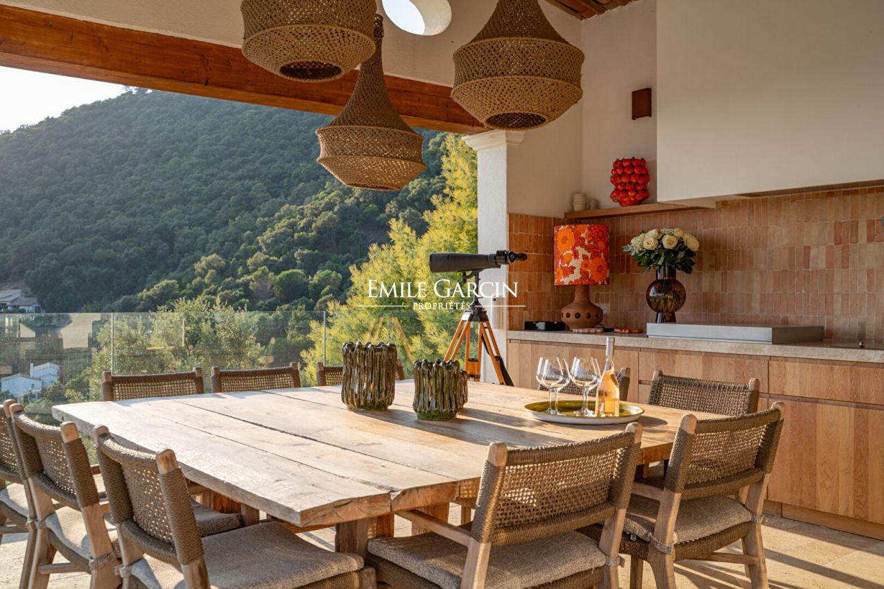 Située à La Croix-Valmer, au sein d'un domaine fermé et sécurisé, cette élégante villa offrant une superbe vue mer et collines se distingue par sa décoration soignée et ses cinq chambres confortables. Elle dispose également de nombreux espaces extérieurs conviviaux, d'une piscine sécurisée et d'un terrain de pétanque, parfaits pour profiter pleinement de l'art de vivre tropézien.