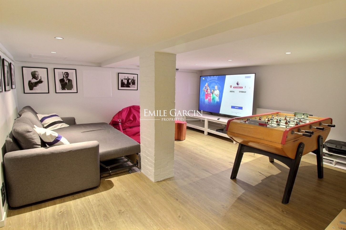 Dans le souplex, une salle de cinéma avec 1 grand canapé convertible en lit double d'appoint avec un babyfoot ainsi qu'une buanderie.