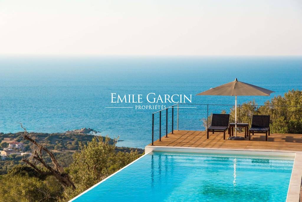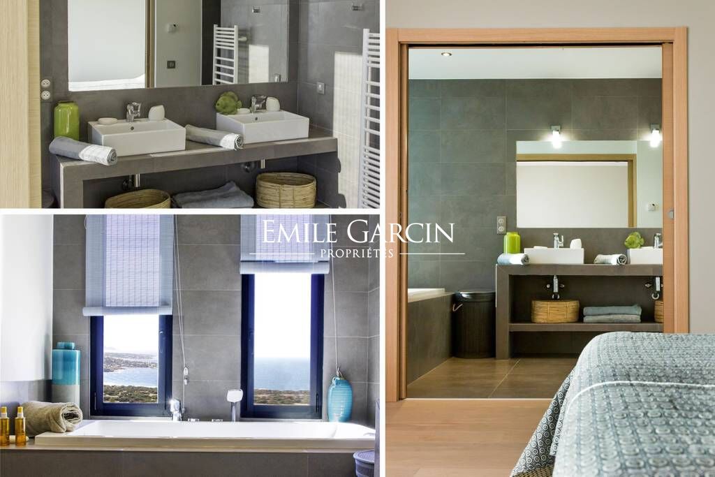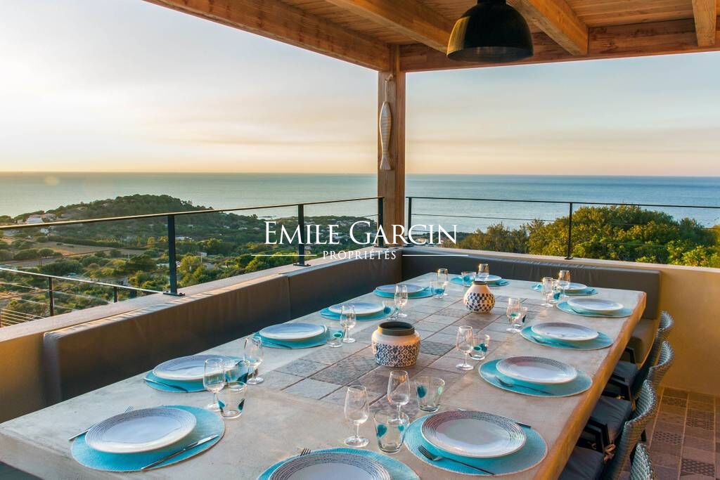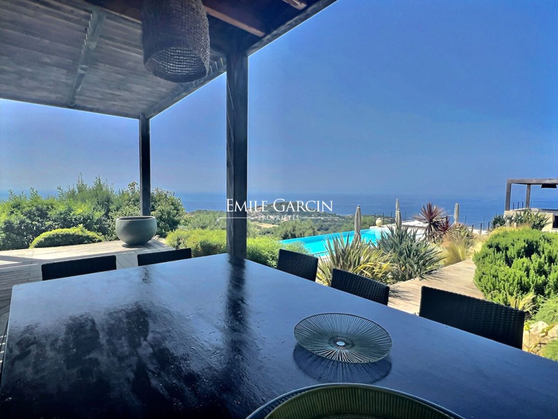 A l'extérieur, les terrasses en teck entourent la maison et mènent à une grande piscine à débordement chauffée, tournée vers la mer. Un vaste espace en bois de plus de 500 m² invite à la détente sous le soleil corse. Le pool house, parfaitement équipé avec cuisine, plancha, barbecue, réfrigérateur, lave-vaisselle et grande table conviviale, permet de partager de délicieux moments en toute sérénité. Un terrain de pétanque complète l'espace de loisirs.