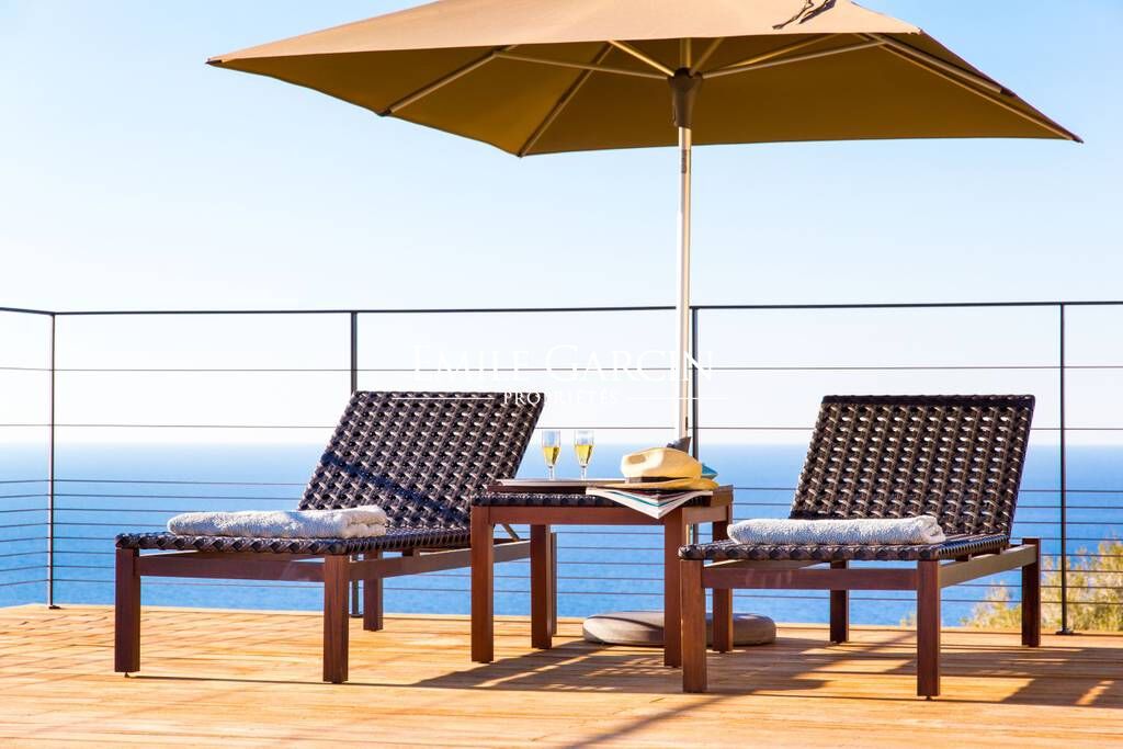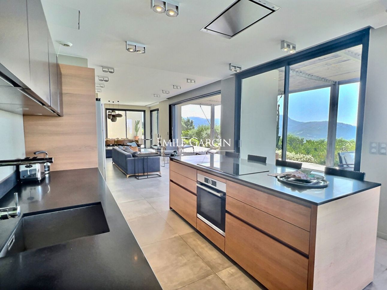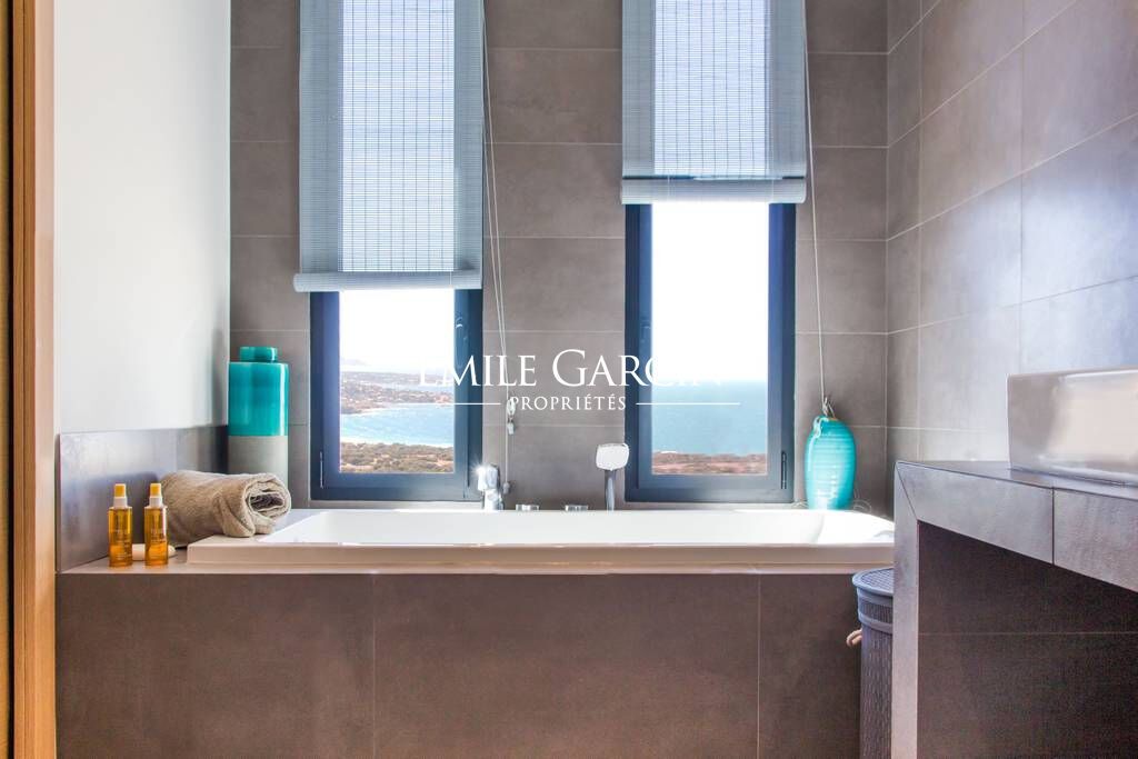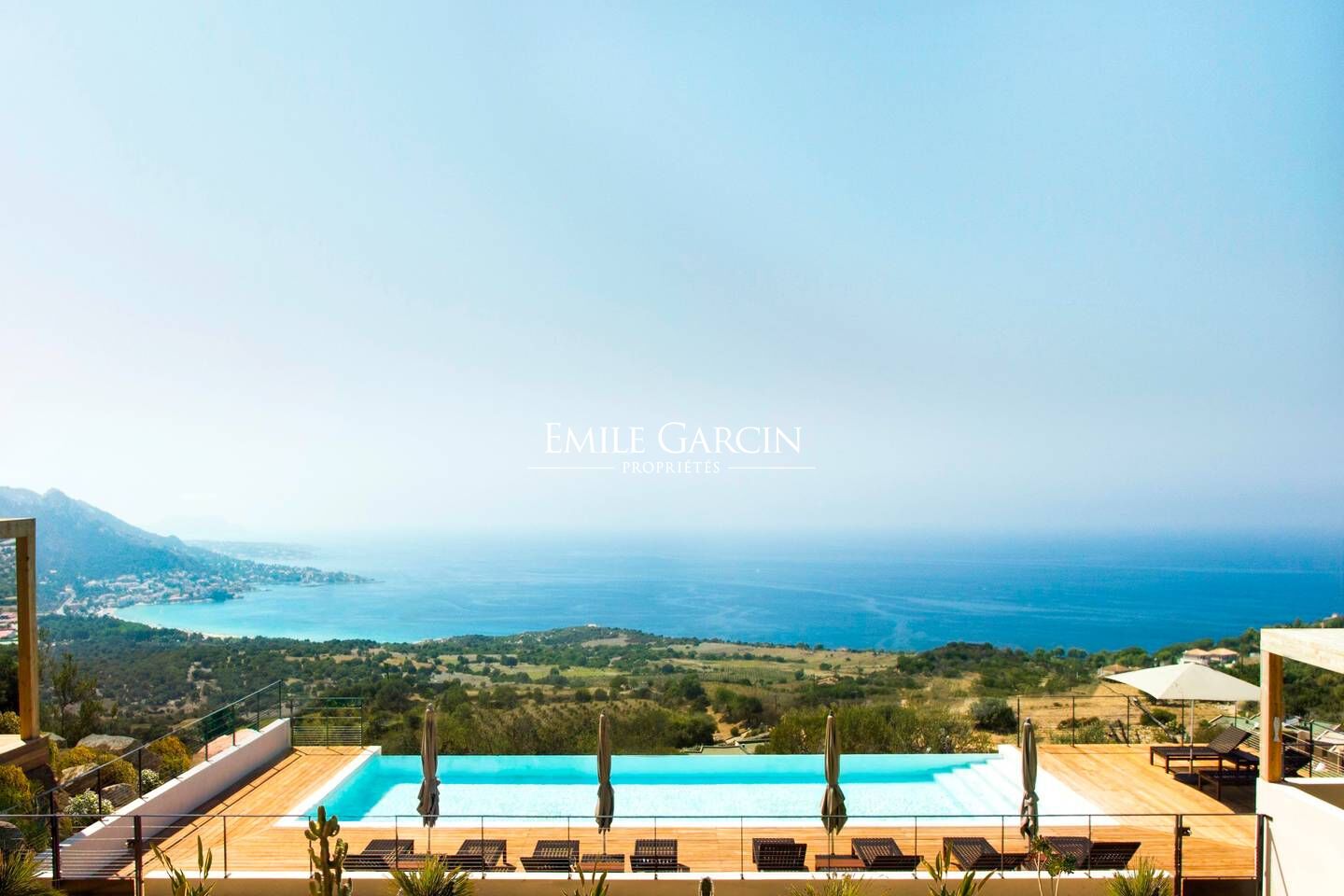 A l'extérieur, les terrasses en teck entourent la maison et mènent à une grande piscine à débordement chauffée, tournée vers la mer. Un vaste espace en bois de plus de 500 m² invite à la détente sous le soleil corse. Le pool house, parfaitement équipé avec cuisine, plancha, barbecue, réfrigérateur, lave-vaisselle et grande table conviviale, permet de partager de délicieux moments en toute sérénité. Un terrain de pétanque complète l'espace de loisirs.