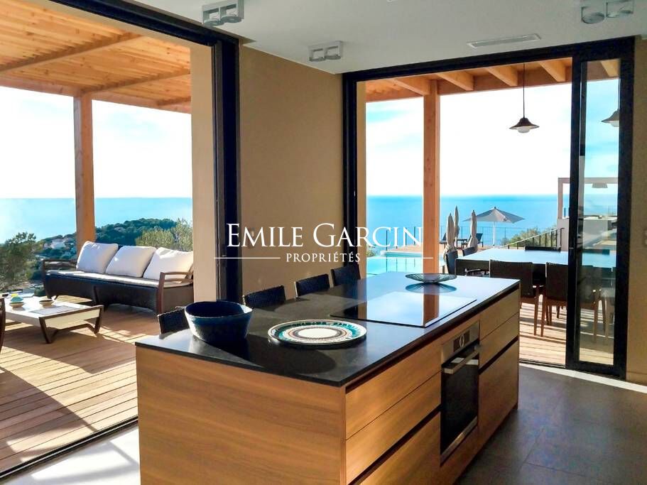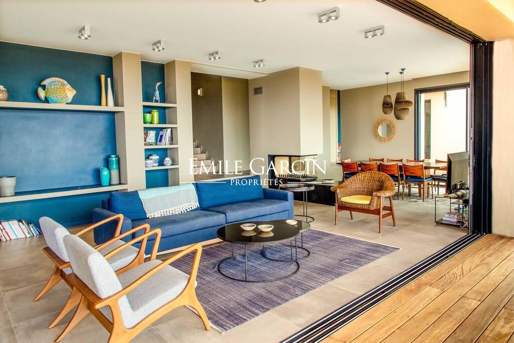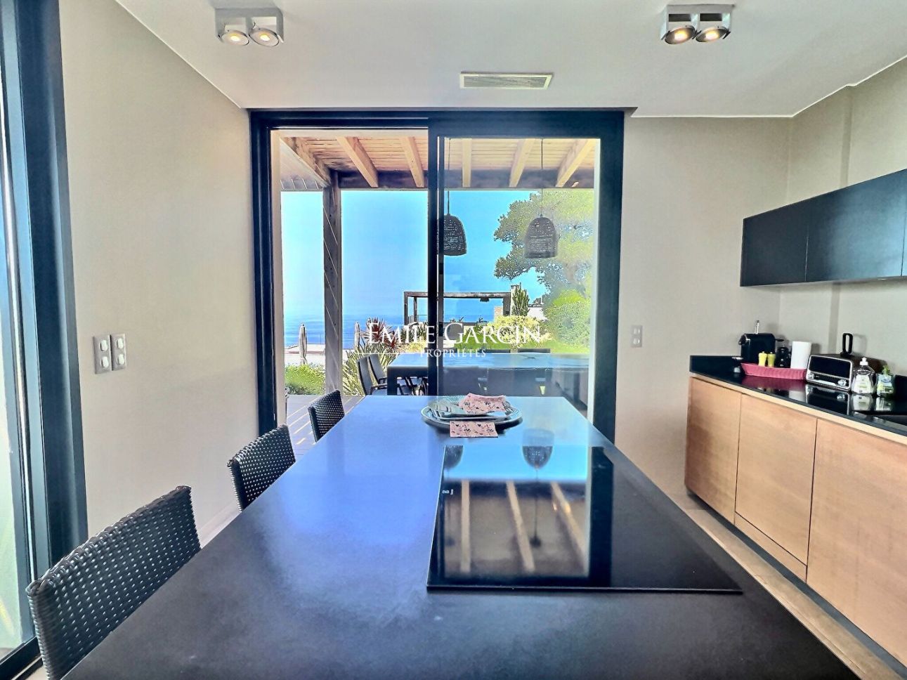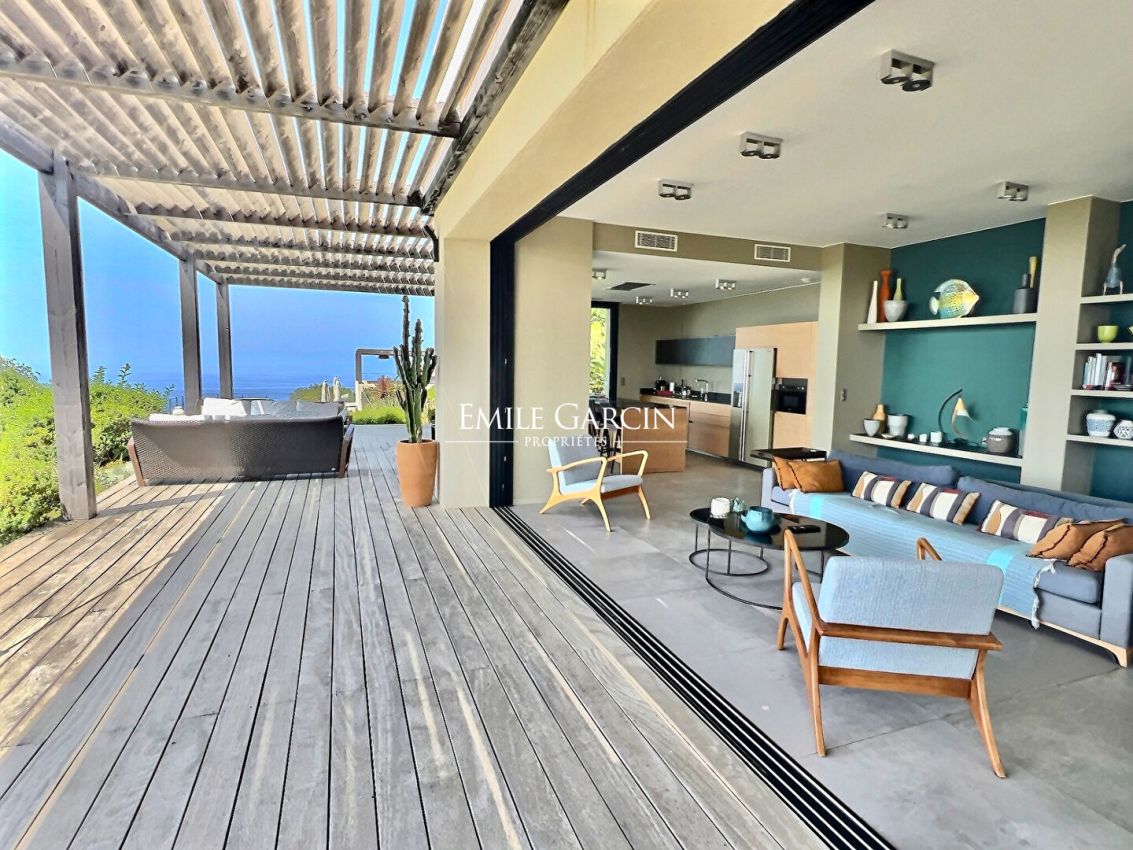 Conçue en paliers pour épouser la pente du terrain, chaque pièce de la maison a été pensée pour bénéficier d'une orientation vers la mer, assurant des panoramas spectaculaires et des couchers de soleil inoubliables. Le vaste salon et la salle à manger, dotés de mobilier en bois exotique et d'une cheminée en insert, s'ouvrent sur de larges baies vitrées offrant un panorama grandiose. La cuisine ouverte, entièrement équipée, se prolonge naturellement vers les espaces extérieurs protégés par des pergolas.