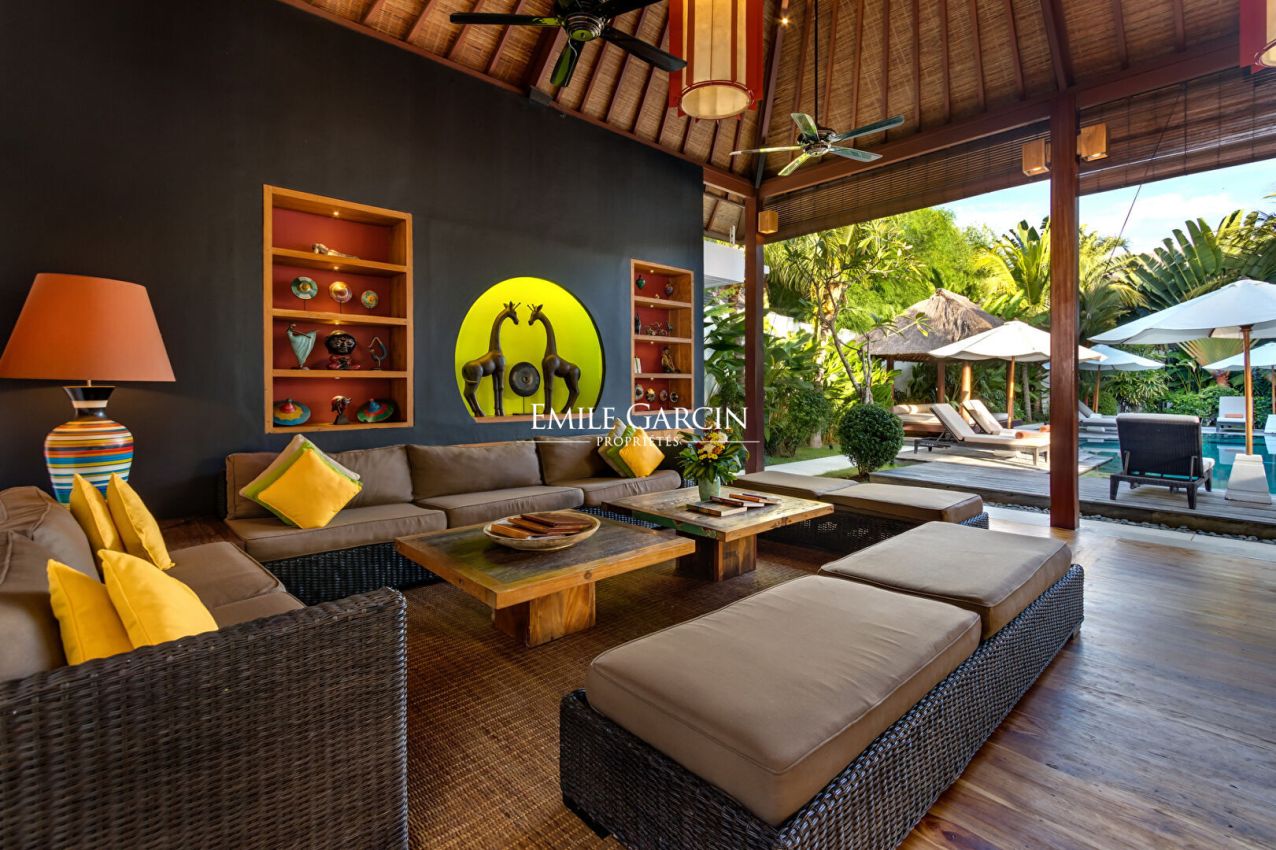 Le salon communique harmonieusement avec le jardin, offrant des touches charmantes telles que des planchers en teck ancien, un ventilateur de plafond, un système audio de qualité et un grand canapé en rotin, parfait pour se détendre entre amis et en famille.