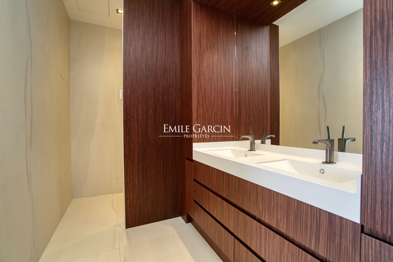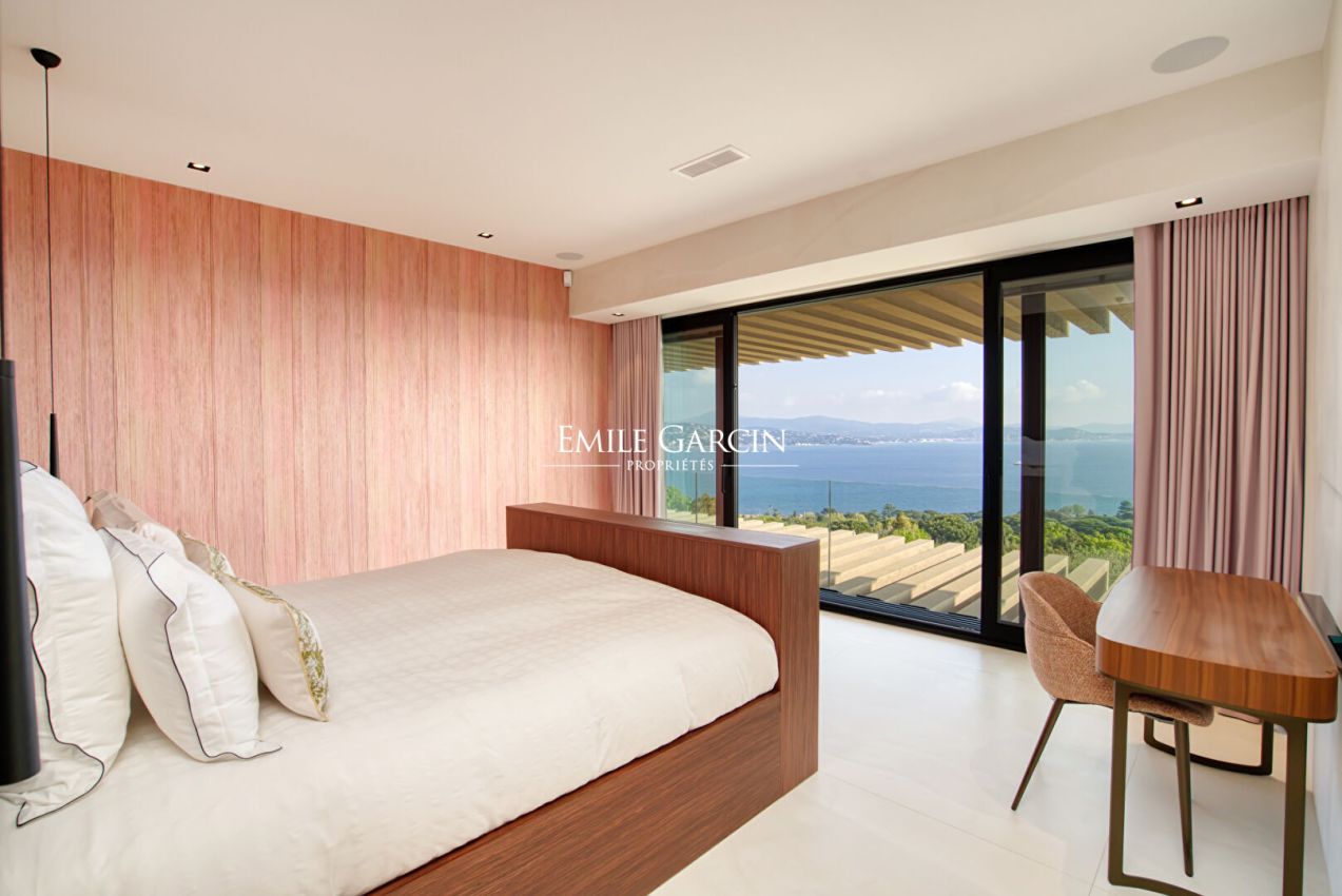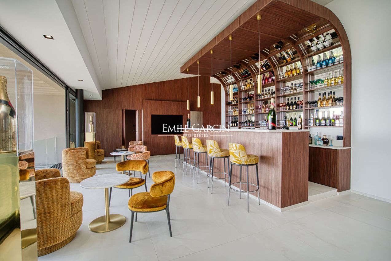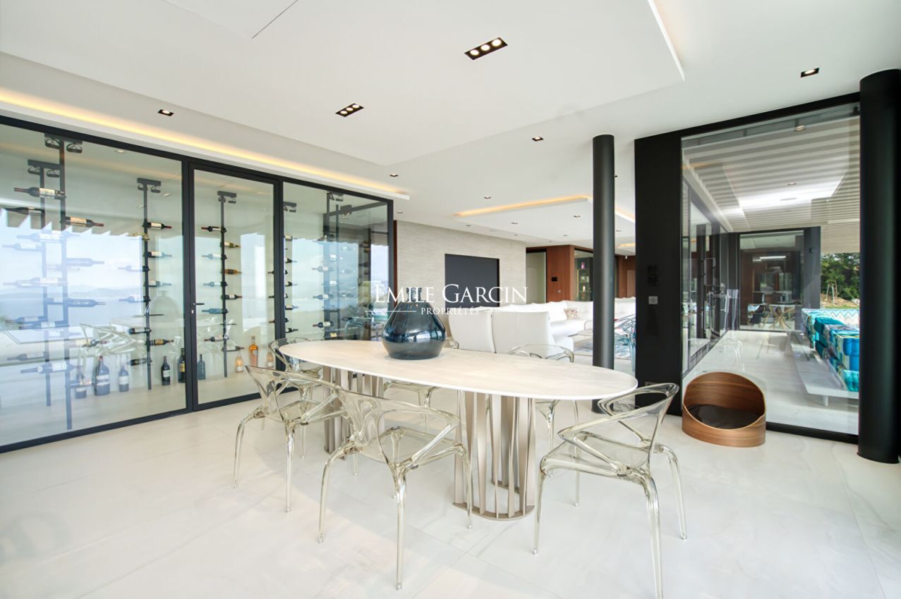 Située dans le domaine de Sinopolis, cette somptueuse propriété moderne offre des prestations haut de gamme et une vue mer panoramique à 180°. Elle se distingue par ses vastes espaces de vie, comprenant un double salon, une salle à manger élégante et une cuisine ouverte avec îlot central, une grande cave à vin et une chambre froide. Lounge/bar à vin à l'étage. Côté nuit, la villa dispose de 5 chambres dans la maison principale ainsi que 3 chambres supplémentaires réparties dans des appartements indépendants, offrant confort et intimité à chaque invité. Pour des instants de détente absolue, profitez d'une piscine chauffée à débordement (15x4m), d'une salle de sport, d'un sauna et d'une salle de massage. Un bien d'exception alliant luxe et sérénité.